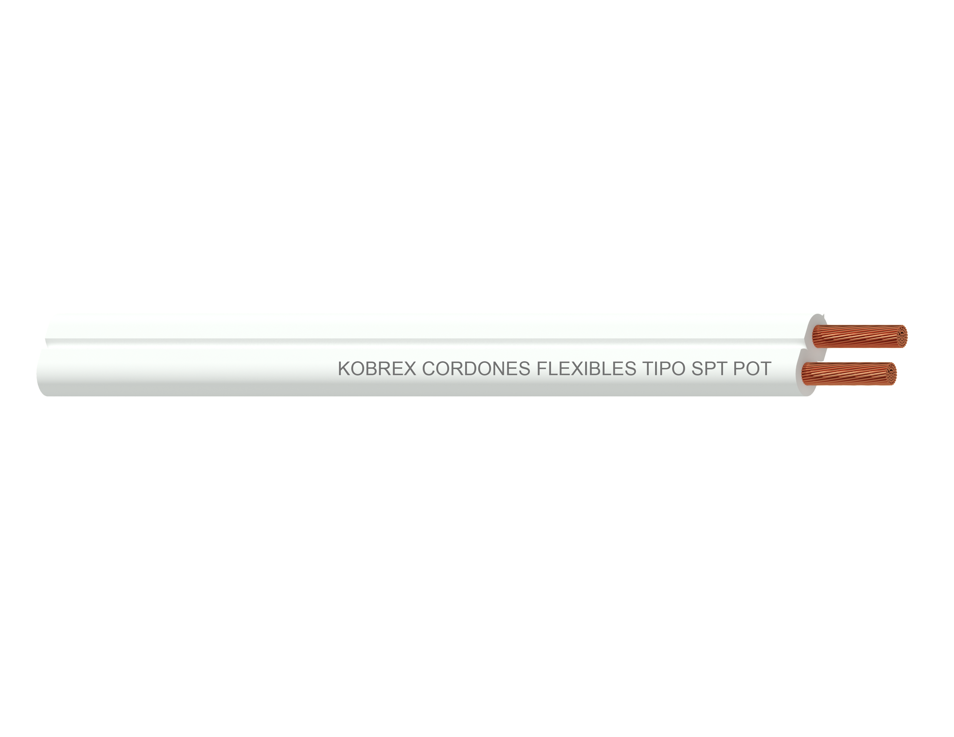 Cordón formado por dos conductores paralelos de cobre electrolítico de 99.9% de pureza en temple suave, cableado clase K, aislamiento PVC y unidos con una pista del mismo material.